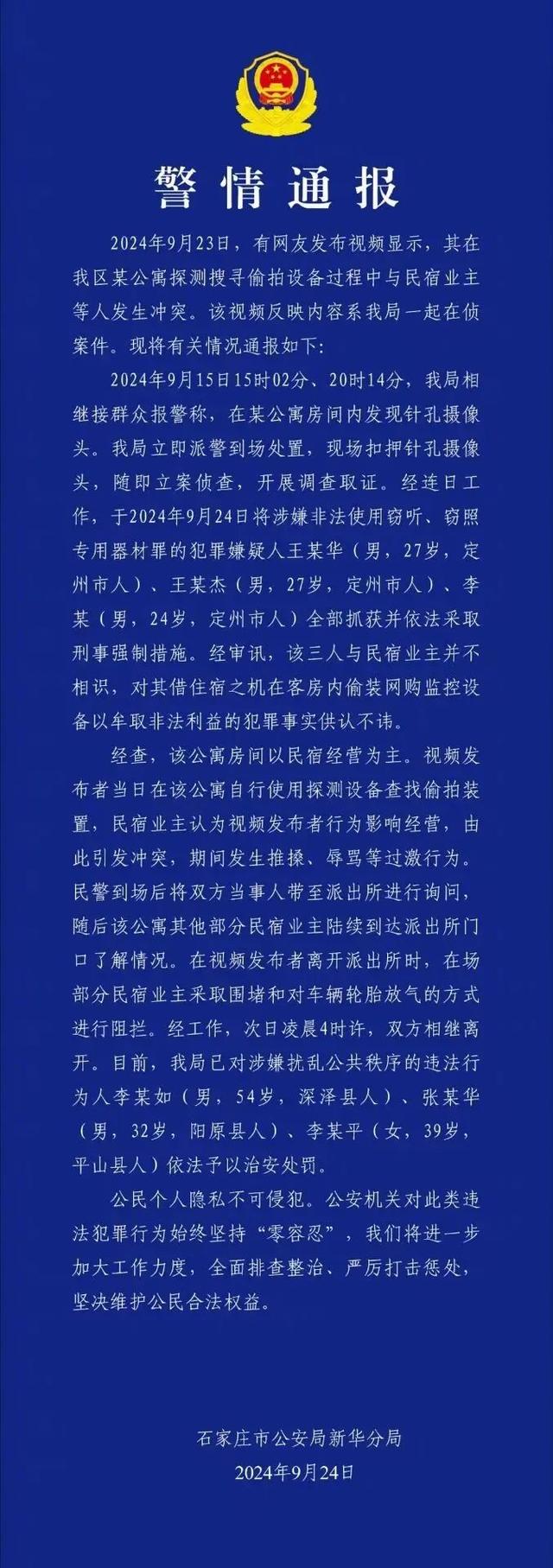 9月24日,石家庄市公安局发布警情通报,已将涉嫌非法使用窃听、窃照的三名嫌疑人全部抓获,并采取刑事强制措施。