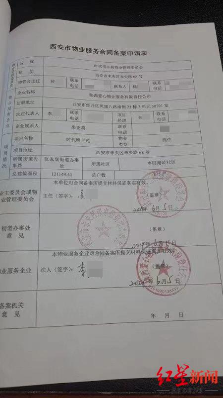 爱心物业公司负责人李经理向红星新闻出示了其公司签署合同后向管理部门备案的证明:落款日期为6月5日的西安市物业服务合同备案申请表上,张家堡街道办事处加盖了公章,以示备案;6月18日,爱心物业公司获得未央区行政审批服务局的备案回执,回执上加盖了公章。