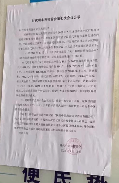 9月24日,红星新闻获取了时代明丰苑小区业主大会〔2022〕01号表决决议。文件显示,2022年7月15日小区通过业主大会表决的方式,决定公开招投标选聘物业服务企业。该小区物业管理委员会负责人之一史某告诉记者,决议通过后当年8月就选定了西安某物业公司。