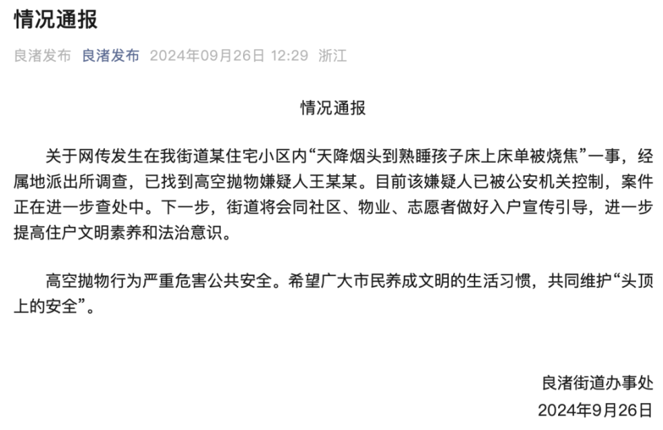 关于网传发生在该街道某住宅小区内“天降烟头到熟睡孩子床上床单被烧焦”一事,经属地派出所调查,已找到高空抛物嫌疑人王某某。目前该嫌疑人已被公安机关控制,案件正在进一步查处中。