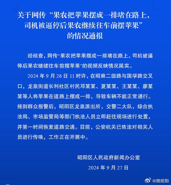 近日,一则云南昭通果农将一袋袋苹果摆放在公路上“拦路”的视频在网上引发热议。9月27日,昭通市昭阳区人民政府新闻办公室发布情况通报称,网传视频反映情况属实,公安机关已对相关人员进行传唤,当地将多举措促进市场经营行为和交通秩序的规范有序。