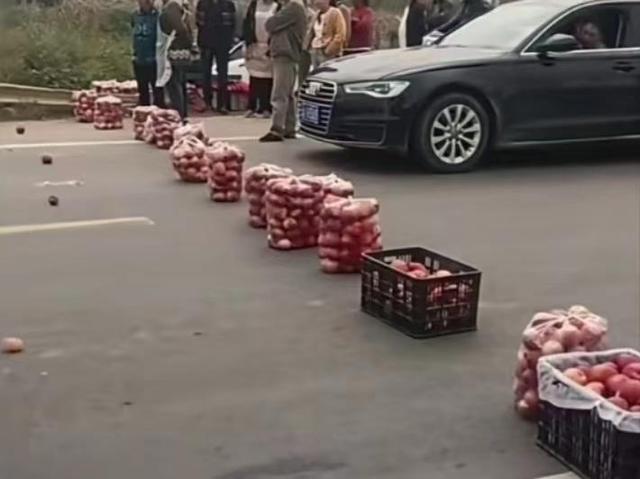 网传视频中,现场有人将打包成袋的苹果排成一排,放在公路上,拦住了车辆去路。其中一辆车直接开了过去,碾坏了苹果。“压了昭通苹果,我们的土特产!”一名男子对车辆驾驶员说道。驾驶人员则回应称:“我们从高速下来,那么快的车开下来,好危险!”