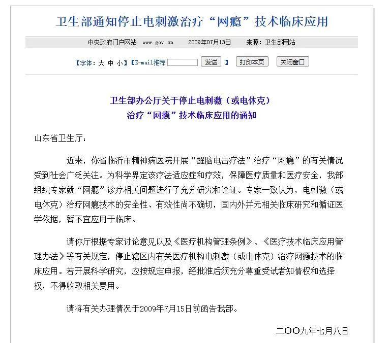 这台电治疗仪如今早已成为历史。2009年,原卫生部向山东省卫生厅致函,要求停止该类治疗手段,“专家一致认为,电刺激(或电休克)治疗网瘾技术的安全性、有效性尚不确切,国内外并无相关临床研究和循证医学依据,暂不宜应用于临床。”