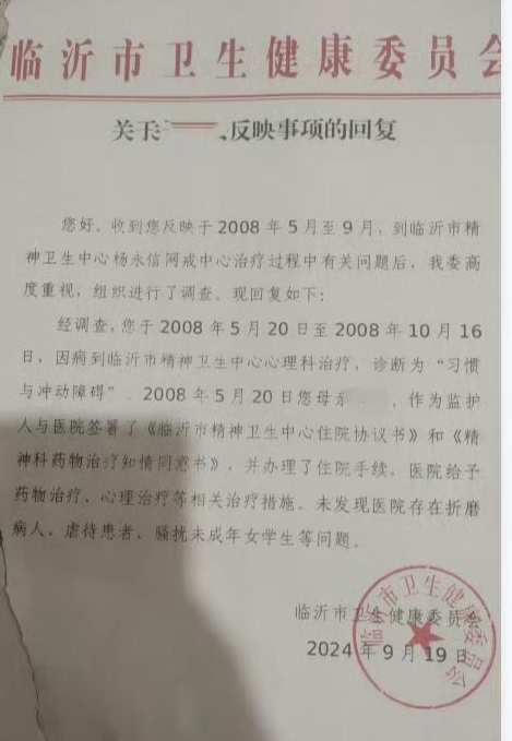 今年9月19日,临沂市卫健委回函称,对于他举报的临沂市精神卫生中心杨永信网戒中心治疗有关问题,经调查“未发现医院存在折磨病人、虐待患者等问题”。