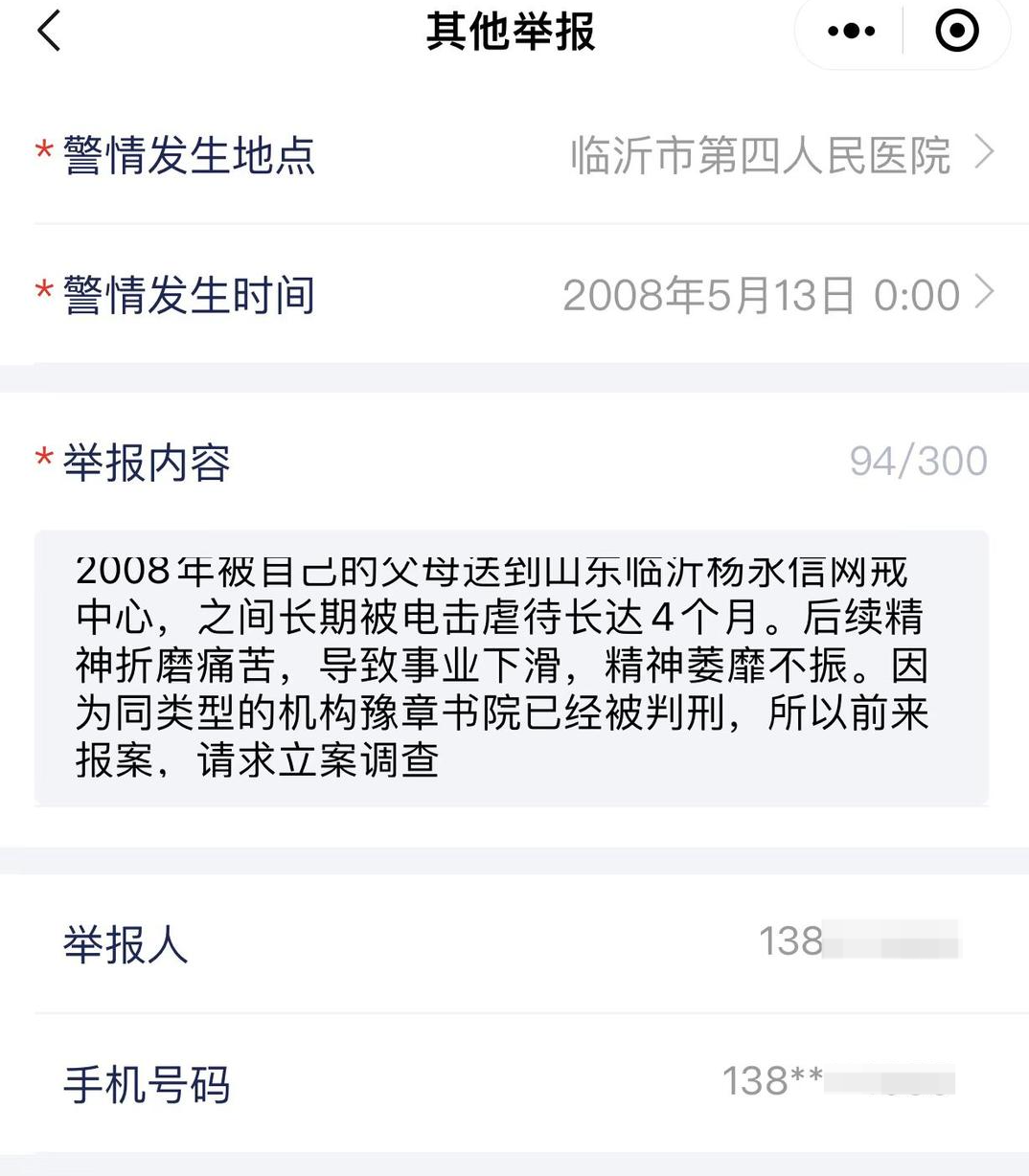 去年4月23日,小周发布了一条微博,称已向所在地公安部门报案,希望追究杨永信和临沂四院(山东临沂市第四人民医院,即临沂市精神卫生中心)相关人员的责任。小周透露,在离开临沂网戒中心15年后,他才决定报警维权,是受到了豫章书院案重审的影响,“就是想要一个结果,无论好坏”。