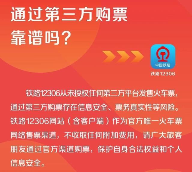 假期临近,出行高峰到来,不少网友会选择用第三方平台购买火车票,那么,从第三方平台买火车票靠谱吗?据中国铁路消息,铁路12306从未授权任何第三方平台发售火车票,通过第三方购票存在信息安全、票务真实性等风险。铁路12306网站(含客户端)作为官方唯一火车票网络售票渠道,不收取任何附加费用,请广大旅客朋友通过官方渠道购票,保护自身合法权益和个人信息安全。