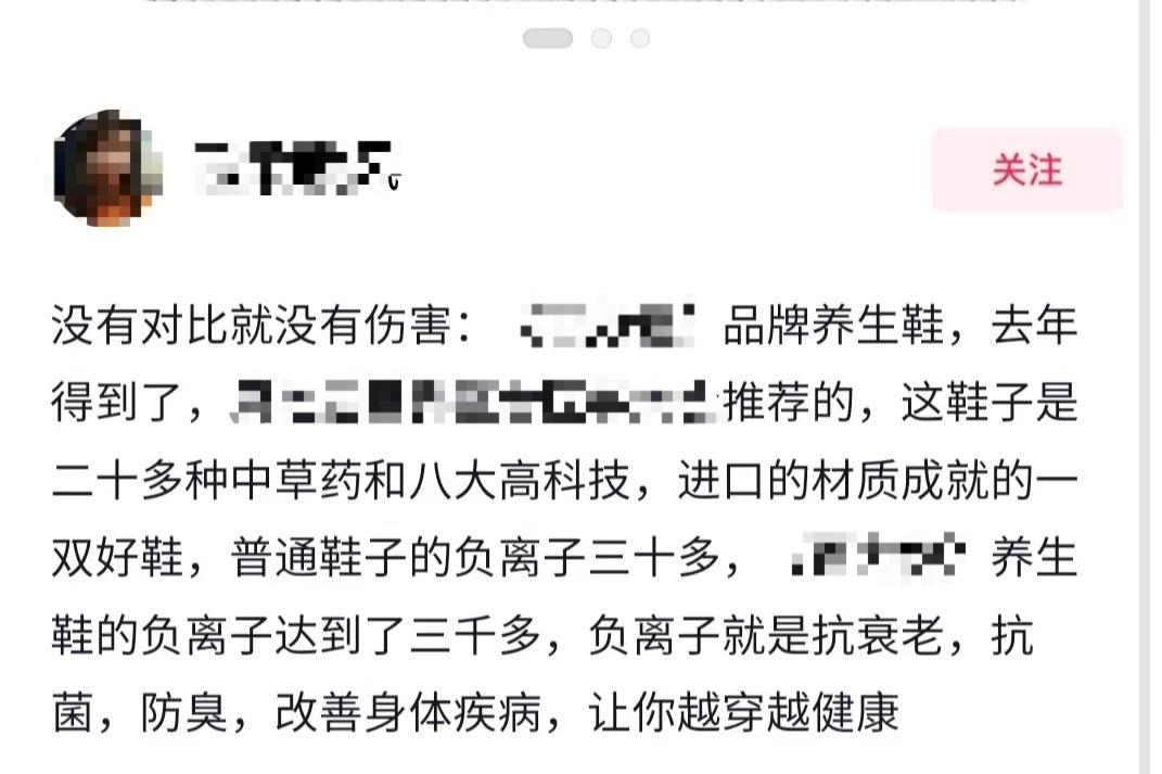 “没有对比就没有伤害!普通的鞋子,负离子含量三十多,XX品牌的养生鞋,负离子含量三千多,负离子就是抗衰老,抗菌,防臭,改善身体疾病,让你越穿越健康……”一家售卖“养生鞋”的商家如此写道。打开售卖网站,这种养生鞋的售价并不便宜,普遍在四五百元。