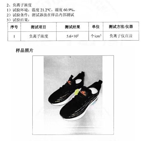 为了证明鞋子具备产生负离子的功能,在售卖页的最下方,商家还放上了一个检测报告。但和广告里吹嘘的“几千个”负离子不同,报告显示,将负离子仪放在鞋子内部进行检测,得到的数据是560个每立方厘米。