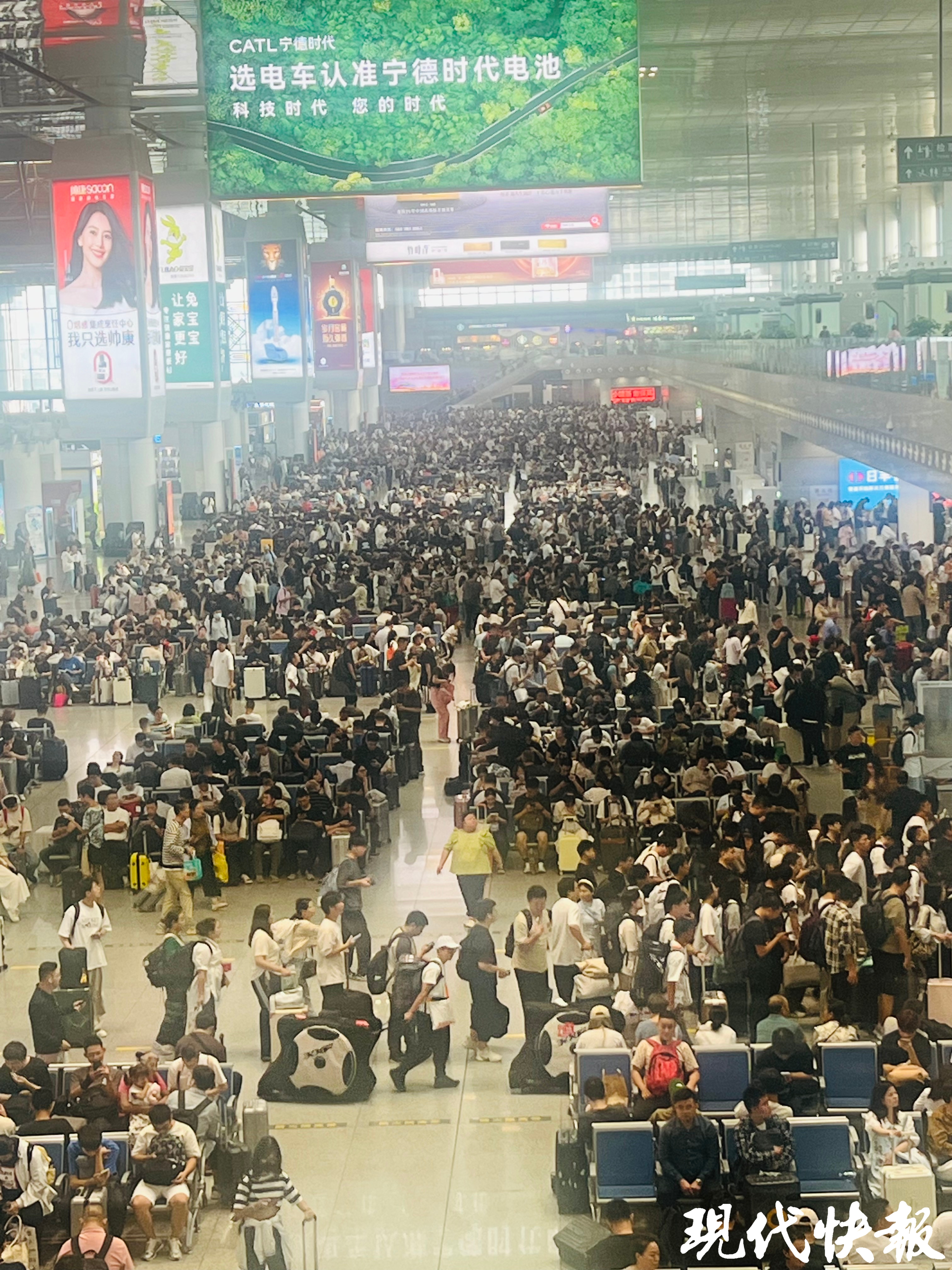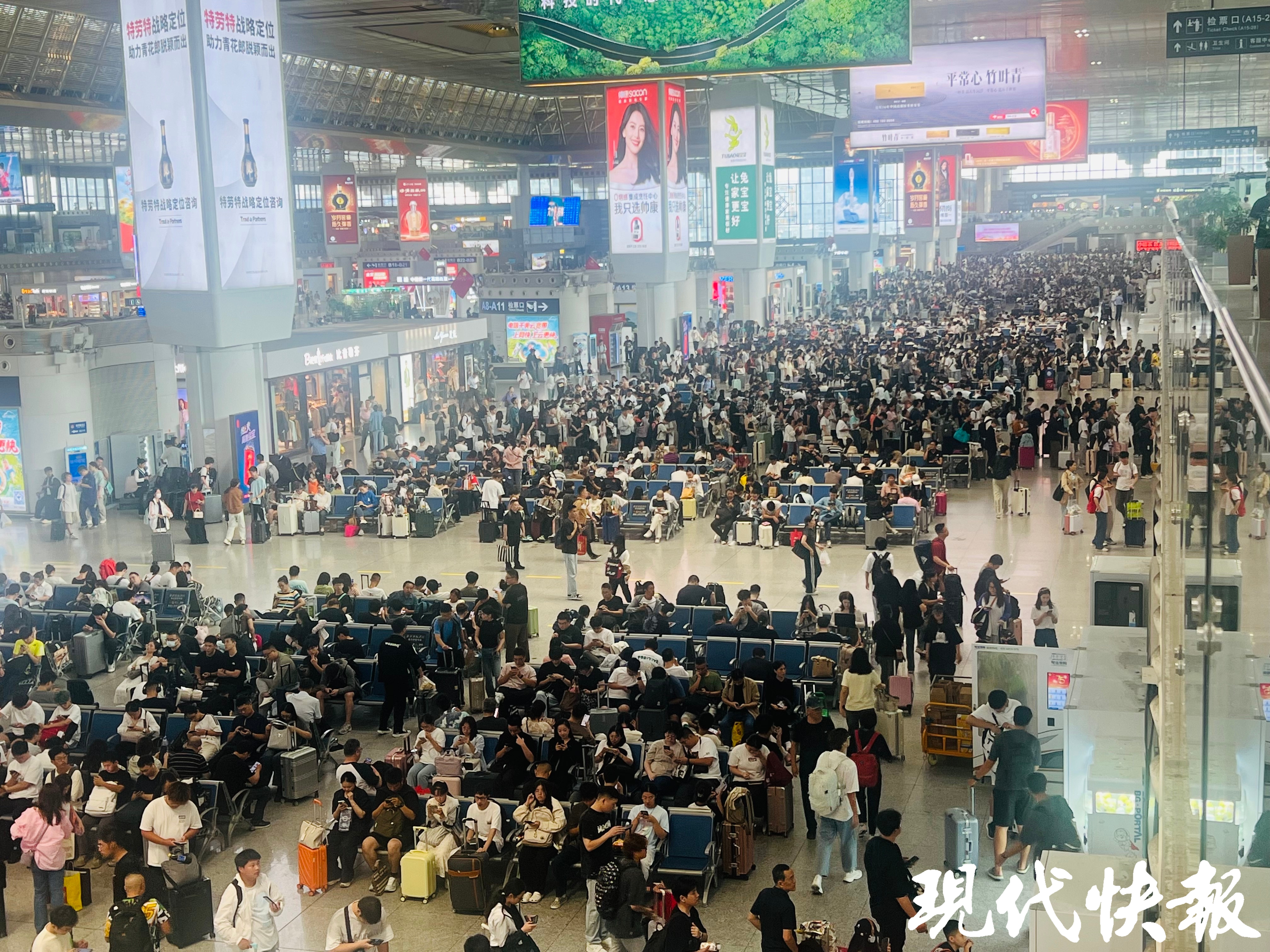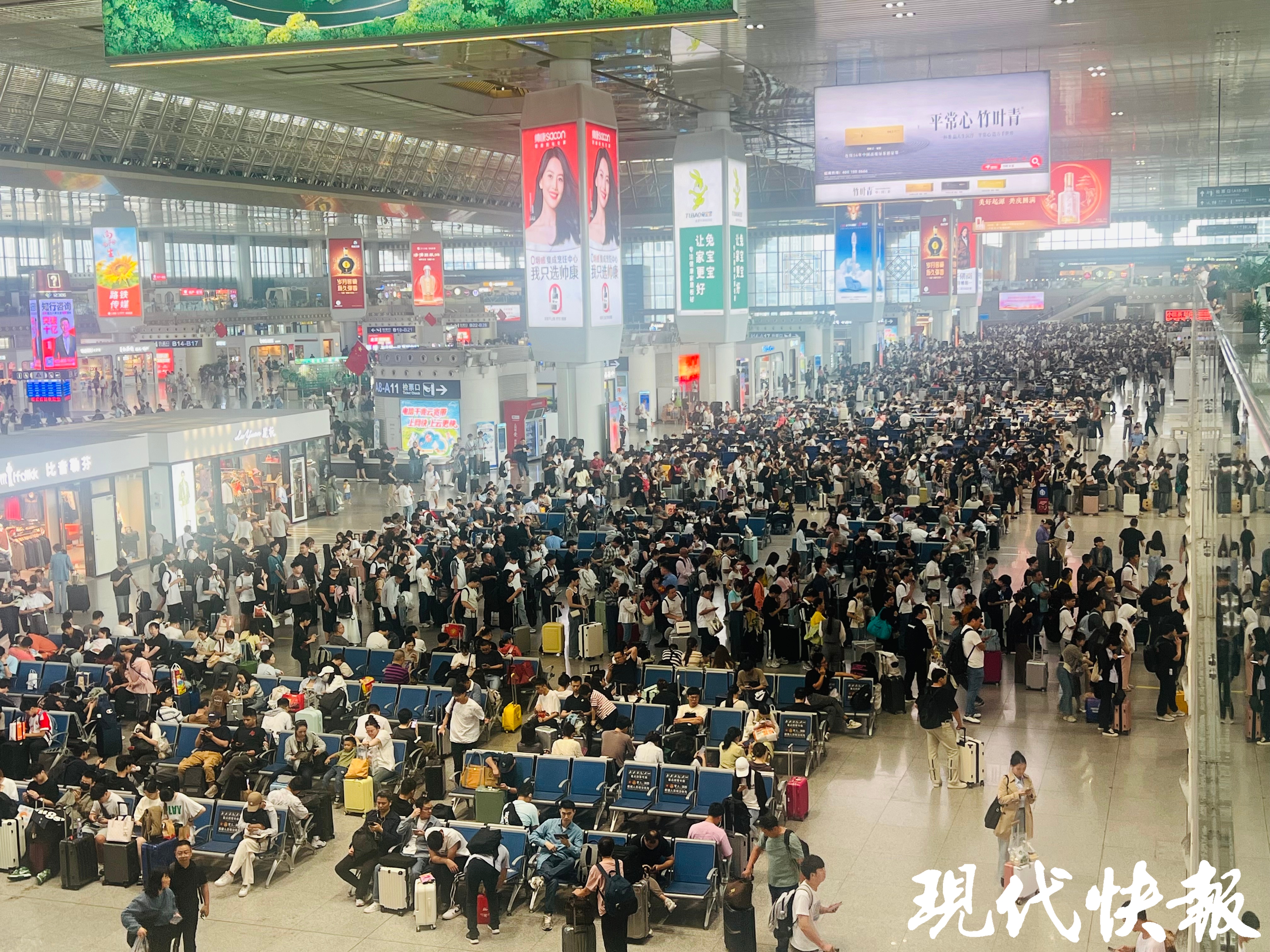 现代快报讯(记者 刘伟娟 文/摄)国庆大客流出行有多火爆,你知道吗?9月30日下午,上到南京南站北落客平台的扶梯处,已经排起了长队,拖着行李的旅客一个挨着一个。进站口、过安检,都得排队。候车大厅内,更是黑压压的全是人。现代快报记者获悉,9月30日,铁路南京站迎来了节前出行客流高峰,当天预计发送旅客33万人次,其中有你吗?