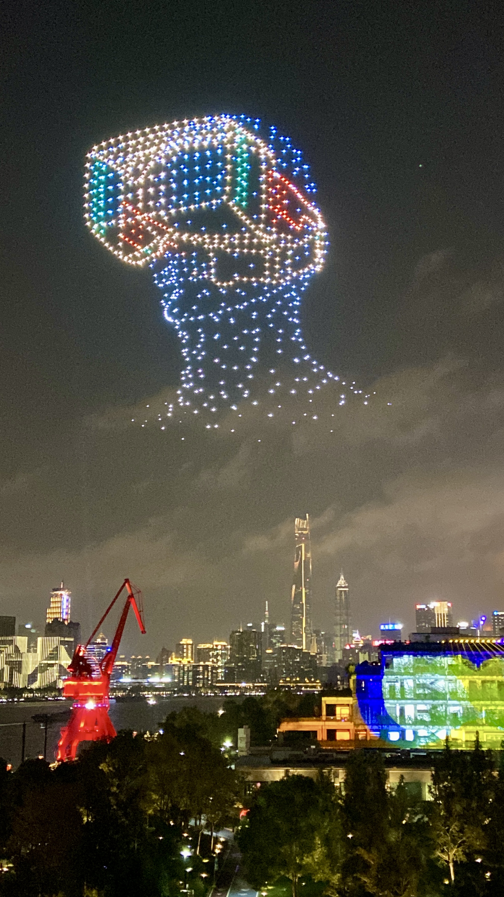 杨浦滨江的无人机光影秀。澎湃新闻记者 陈悦 摄
