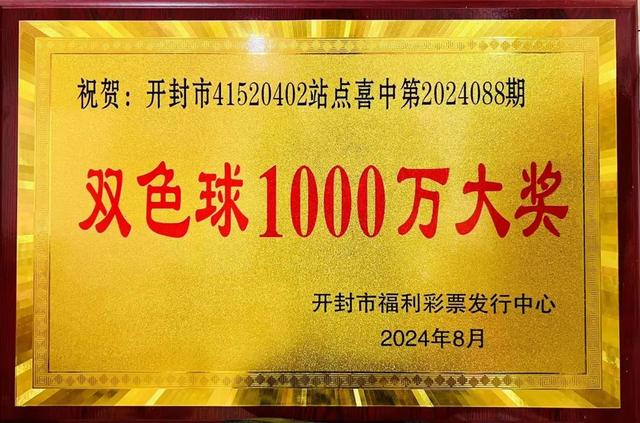 2024年8月1日晚,双色球第2024088期开奖,位于河南省开封市通许县城关镇行政路红双喜宾馆对面的41520402福彩投注站,是一张单式3注票,投注金额6元,其中1注命中大奖,总奖金1000万元。