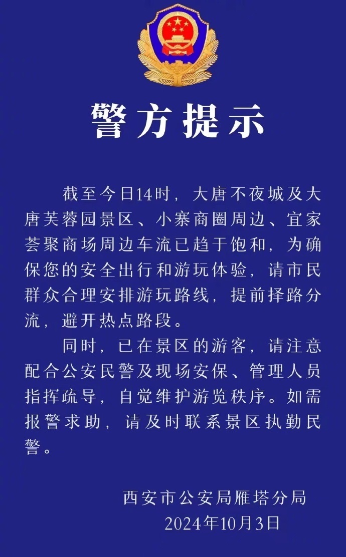 央广网西安10月3日消息(记者刘昱)10月3日,陕西省西安市公安局雁塔分局发布警方提示:截至今日14时,大唐不夜城及大唐芙蓉园景区、小寨商圈周边、宜家荟聚商场周边车流已趋于饱和,为确保您的安全出行和游玩体验,请市民群众合理安排游玩路线,提前择路分流,避开热点路段。