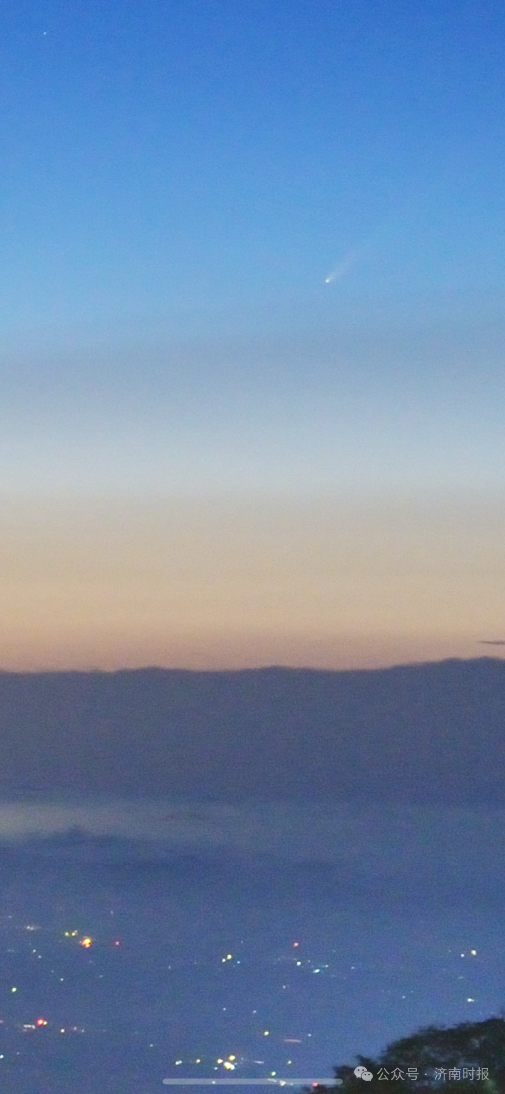 2024年10月1日黎明时分,紫金山-阿特拉斯彗星(C/2023 A3, Tsuchinshan-ATLAS)出现在泰山日观峰上空,济南游客赵建东及很多游客和摄影爱好者成功捕捉到其穿越晨曦的画面。