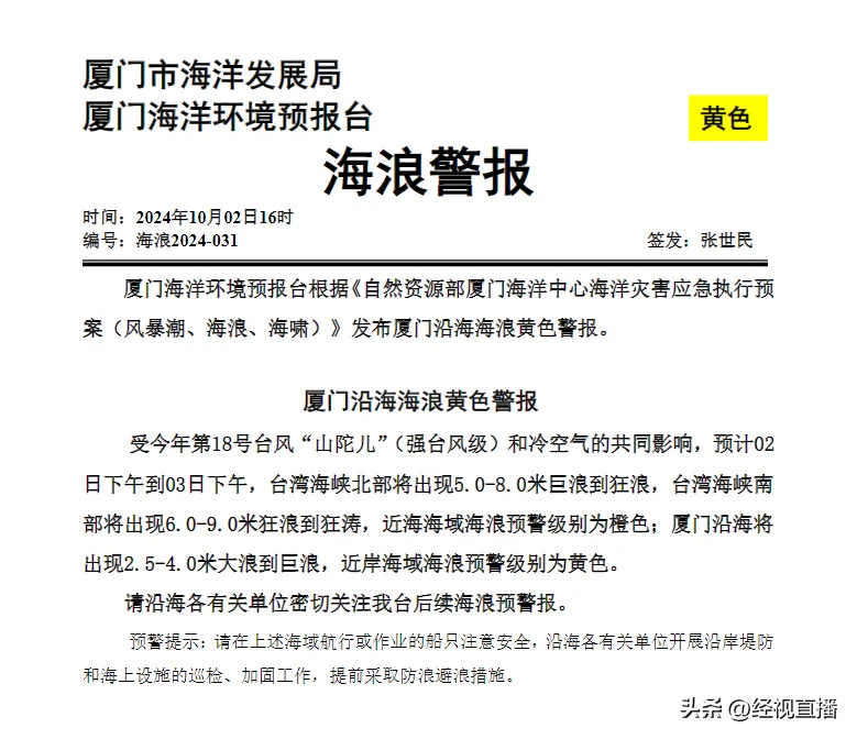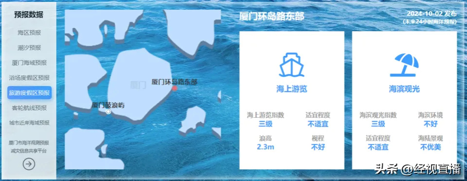 10月2日下午,厦门市海洋发展局、厦门海洋预报台发布海浪黄色警报,受今年第18号强台风“山陀儿”和冷空气共同影响,预计10月2日下午到10月3日下午,厦门沿海将出现2.5-4.0米大浪到巨浪。另据厦门市海洋观测预报减灾信息共享平台浴场及旅游度假区预报显示,截至10月3日,厦门市多个沙滩浴场与滨海景区皆不适宜观光游览。