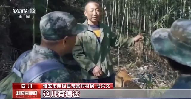 四川省雅安市荥经县常富村村民 马兴文:早上我来检查,看到一只熊猫,这儿有痕迹,有粪便,吃得很少。