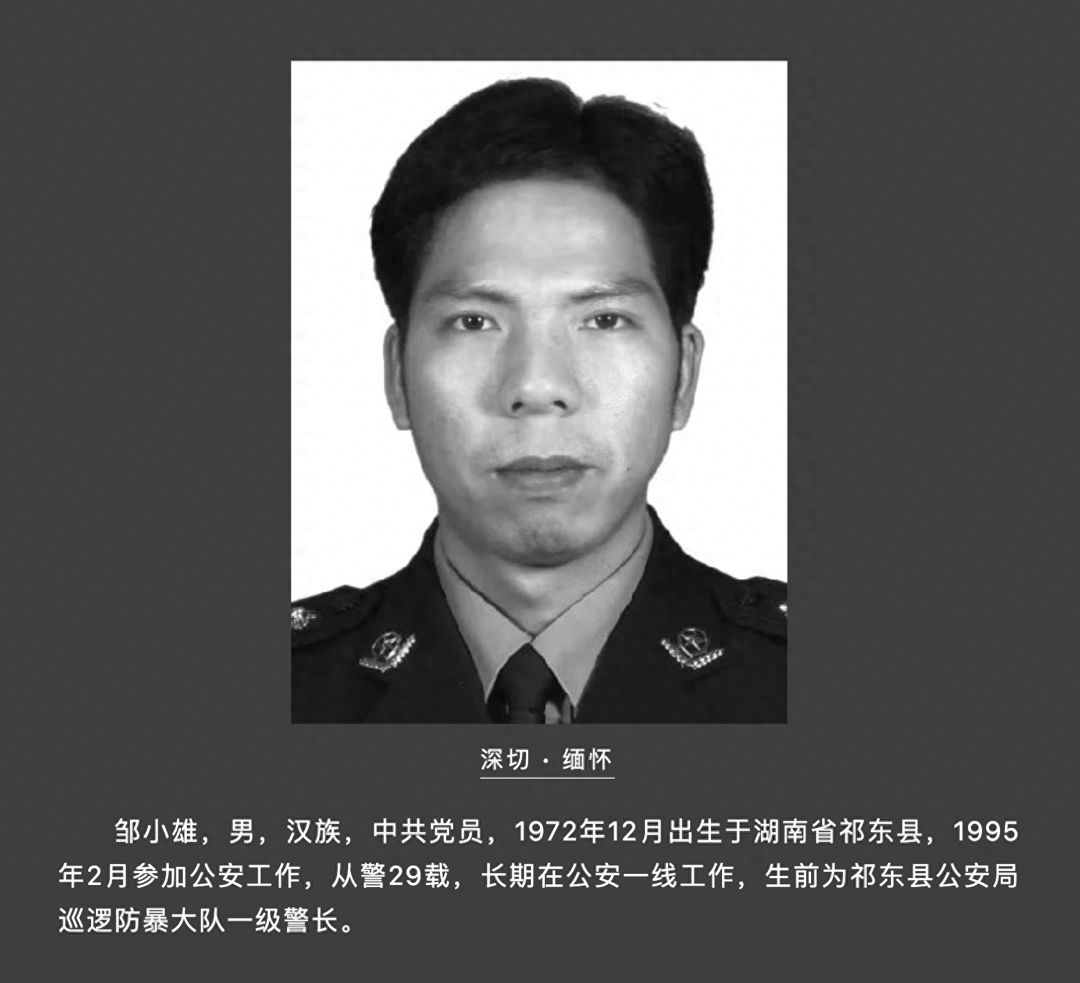 2024年9月29日22时40分,邹小雄在处理一起纠纷警情时突发疾病,经抢救无效于9月30日21时30分因公牺牲,终年51岁。邹小雄先后在祁东县公安局砖塘派出所、双桥派出所、太和堂派出所、玉合派出所、巡逻防暴大队等部门工作,多次被县政府记嘉奖及被县局评为专项行动先进个人。
