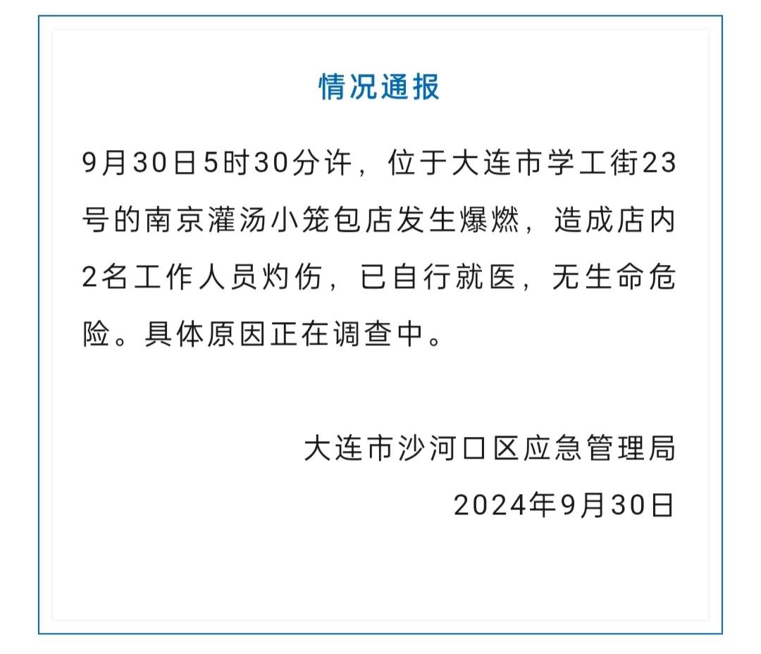 大连市沙河口区应急管理局发布情况通报:9月30日5时30分许,大连市南京灌汤小笼包店发生爆燃。