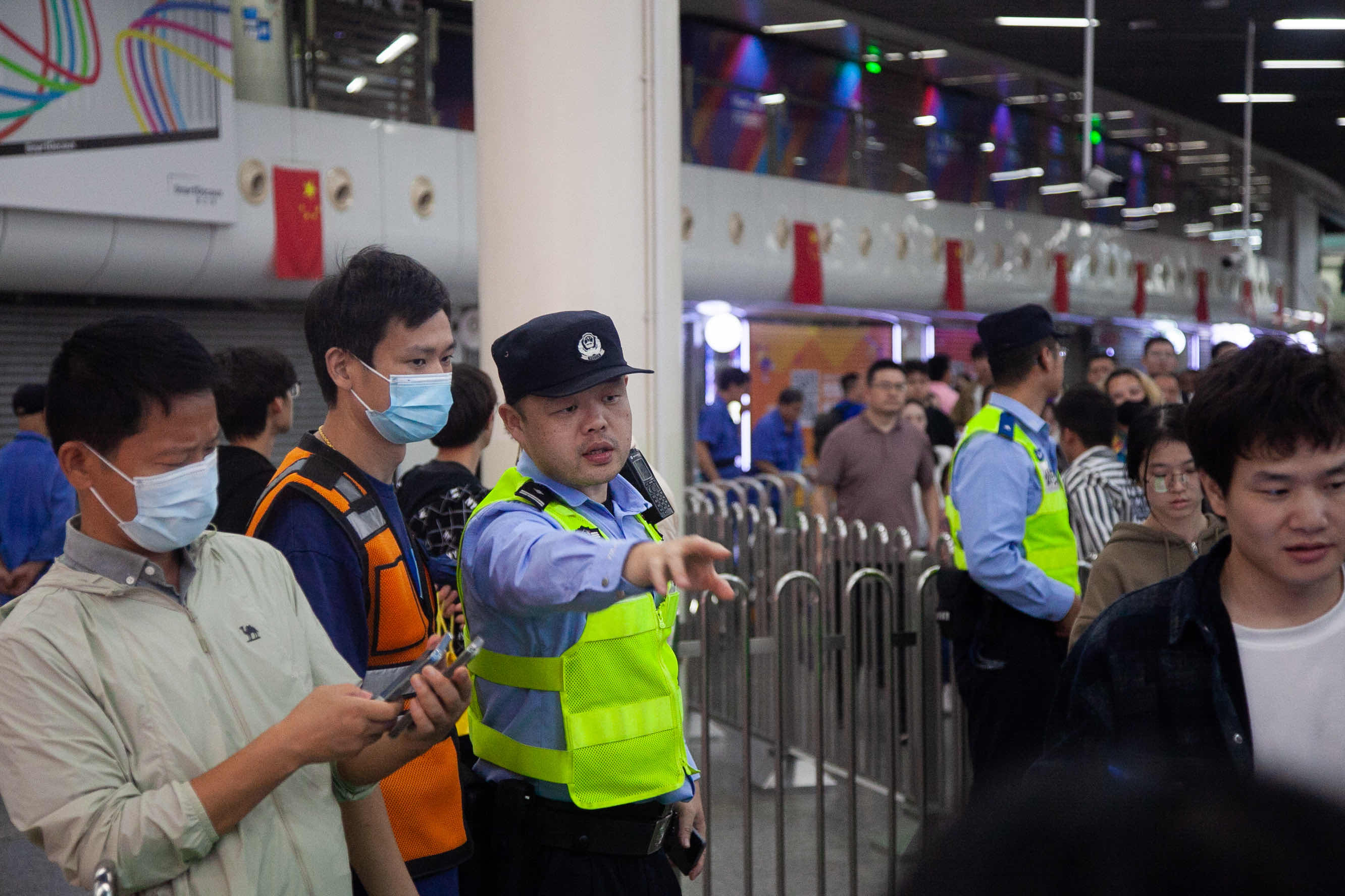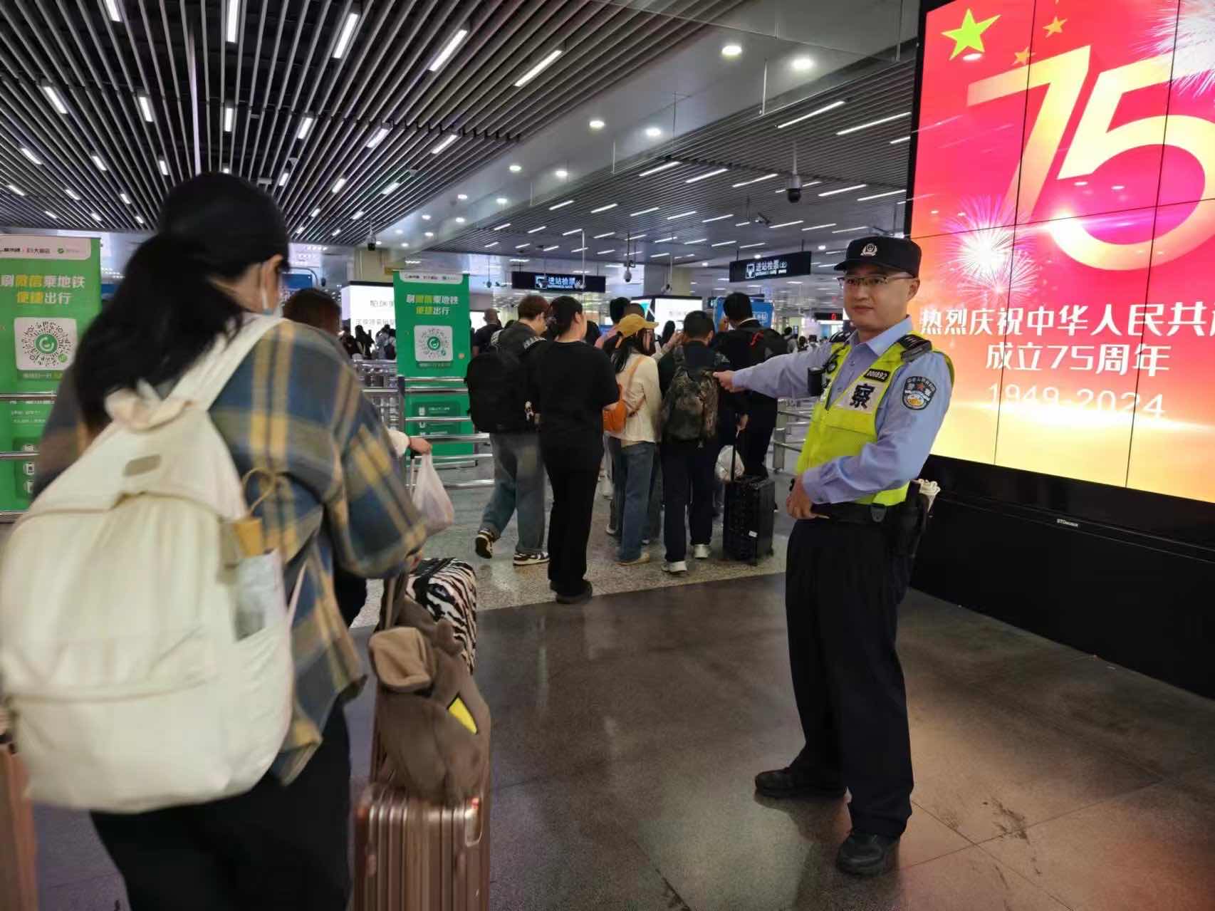 据人民广场站派出所警长杨文彬介绍:“人民广场站是1、2、8三线换乘车站,总共有18个出入口,国庆期间客流数会比平日增加144%,算上叠加的民警和辅警力量120名,安保力量与客流是1:3666的比例,我们客流疏导的压力可想而知。”