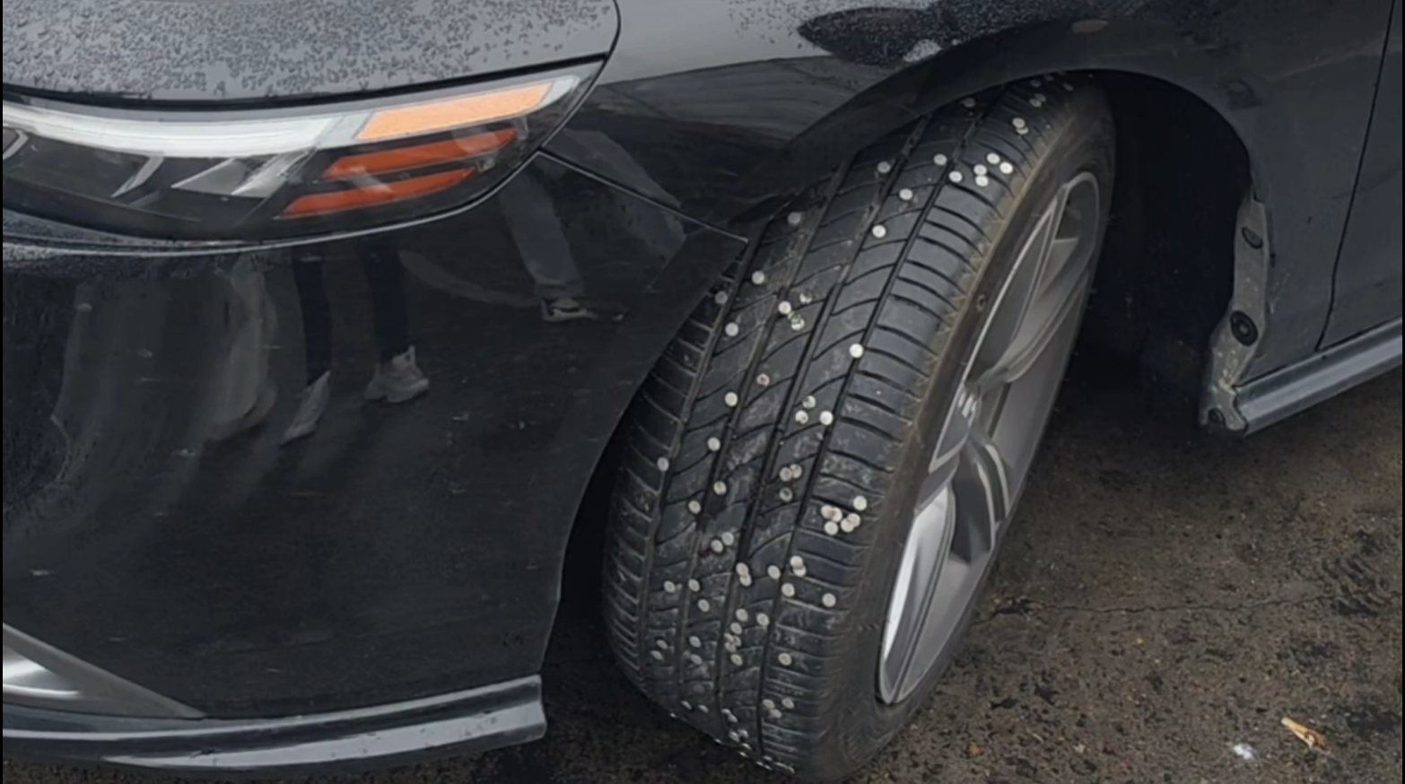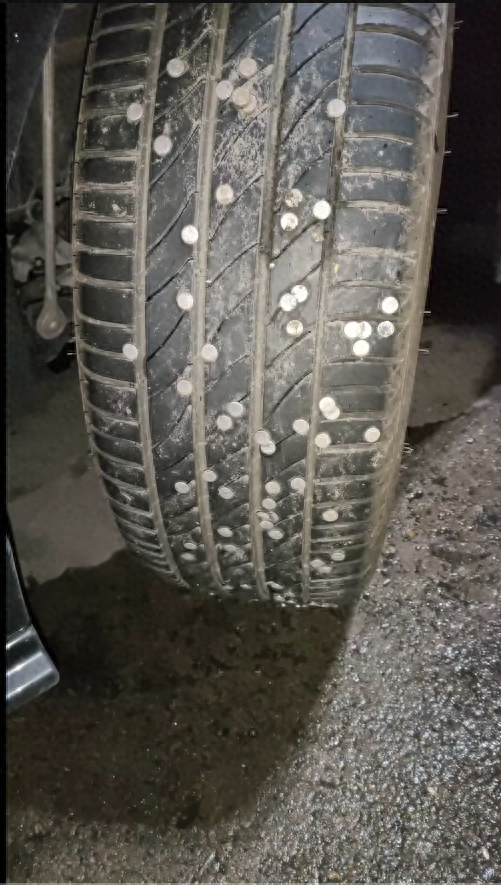 网友发视频反映:多辆汽车轮胎被图钉扎成“刺猬”