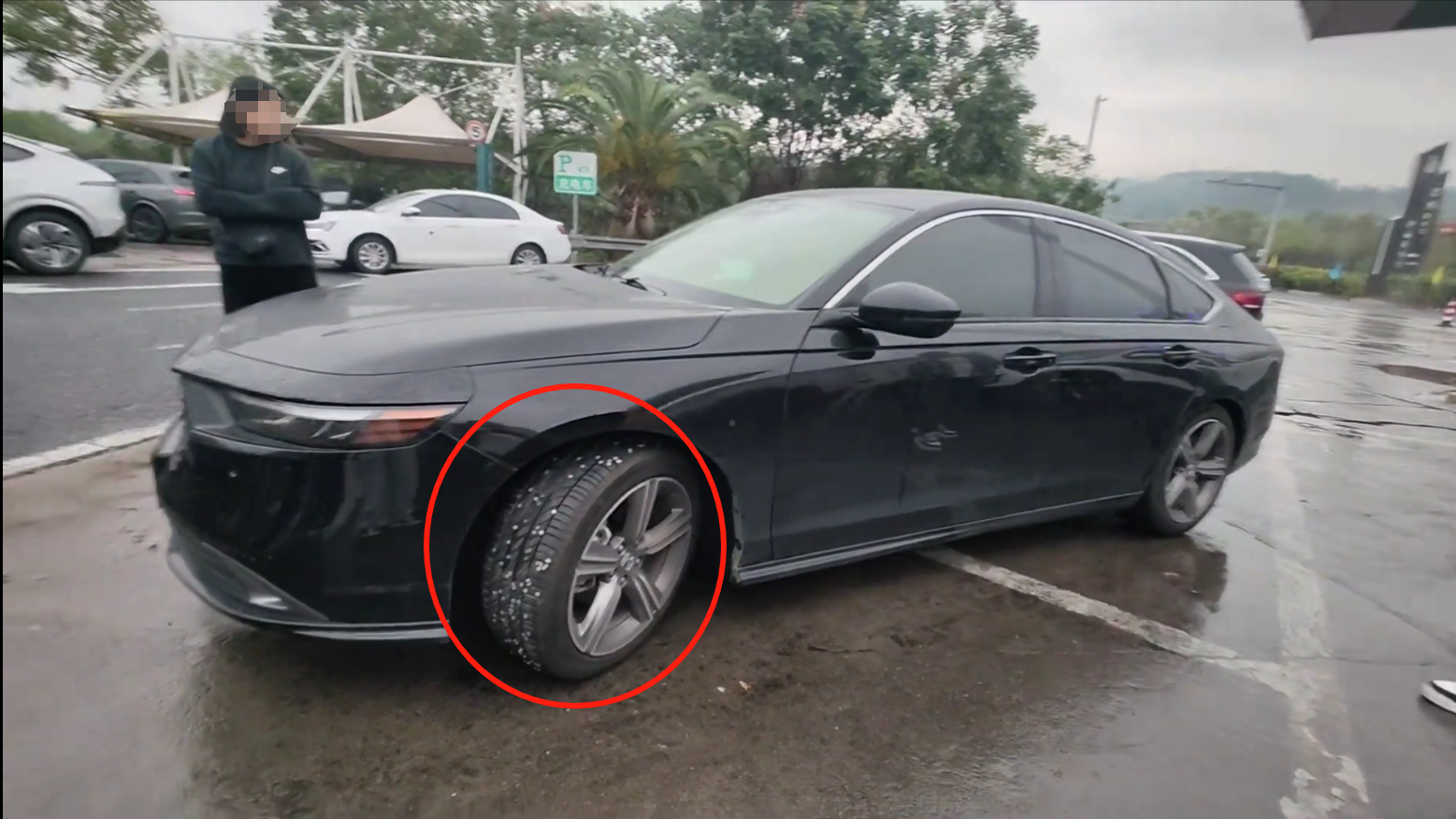 视频中,一辆汽车停在忠州服务区,轮胎上扎了几十个图钉。