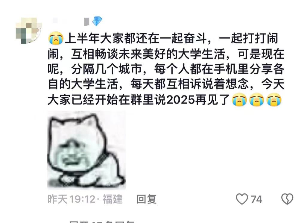 还有不少人突然意识到,明明2024都没见几次,今年就再也没有假期了。随着慢慢长大,和朋友们从每天一见变成了每周一见,再到现在只有节假日才可以见面,和家人也从一天三顿饭变成了每年只能吃几次。