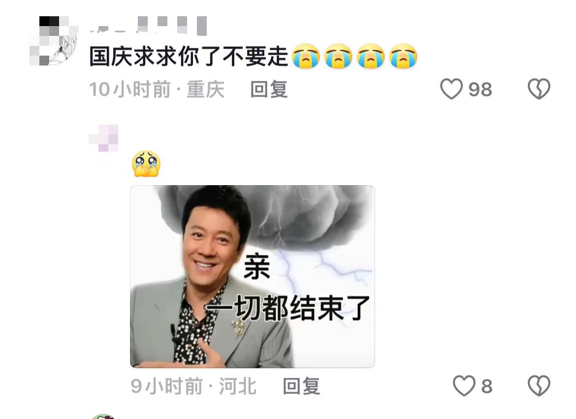 为了挽留假期,有网友在蔡国庆老师社交账号留言“国庆不要走”,还有网友单曲循环周杰伦歌曲《反方向的钟》,企图回到放假前一天。过完2024年的最后一个法定节假日,现在的你在返程的列车上了吗?