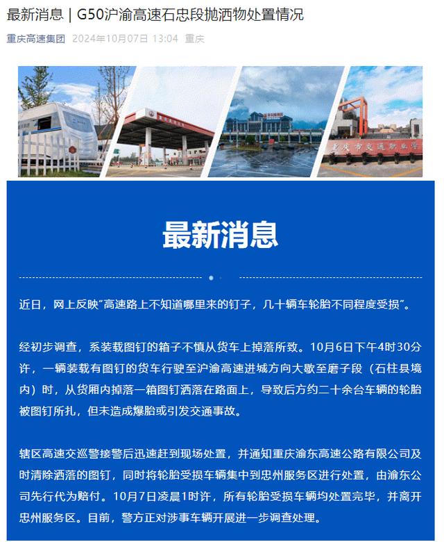 辖区高速交巡警接警后迅速赶到现场处置,并通知重庆渝东高速公路有限公司及时清除洒落的图钉,同时将轮胎受损车辆集中到忠州服务区进行处置,由渝东公司先行代为赔付。10月7日凌晨1时许,所有轮胎受损车辆均处置完毕,并离开忠州服务区。目前,警方正对涉事车辆开展进一步调查处理。