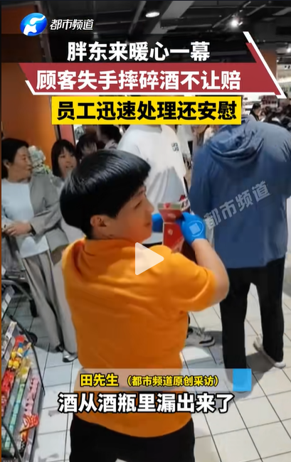 近日,河南许昌,一位顾客在胖东来失手摔碎了一瓶茅台酒,工作人员第一时间安慰顾客并打扫碎片,在该顾客提出要赔偿时,胖东来的工作人员也表示:“不用赔偿。”