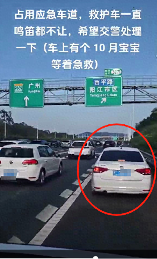 10月6日16时50分,IP地址显示为广东的一位网友在网上发布视频称:护送一个10月龄宝宝到医院抢救,肠道坏死,已开腹,与时间抢生命,救命通道被堵。(小轿车)占用应急车道,救护车一直鸣笛都不让,希望交警处理一下。