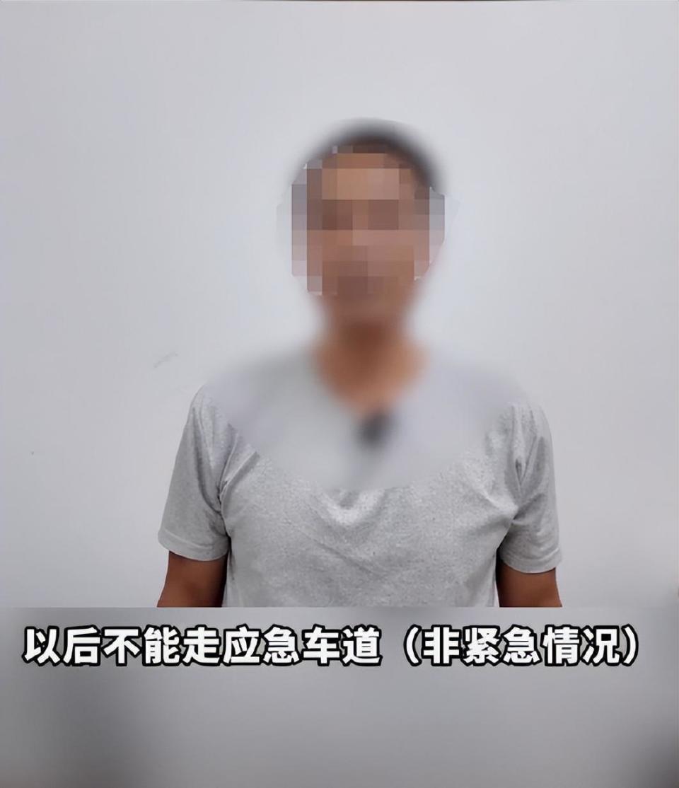 被处罚的车主(男子)在视频中现身说法:“通过这一次交警的教育,(我)知道错误了,以后不能走应急车道(非紧急情况下),要遵守交通规则(法规)。”