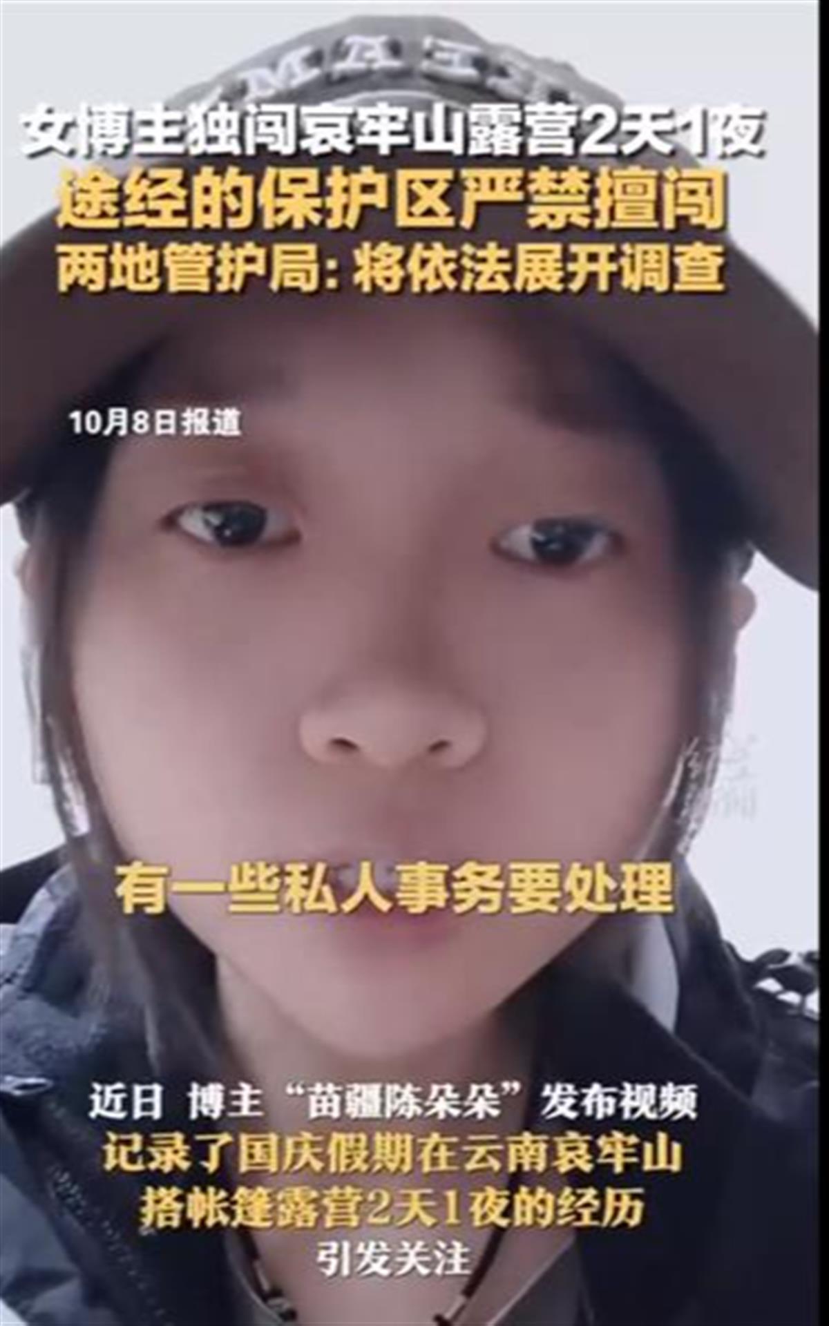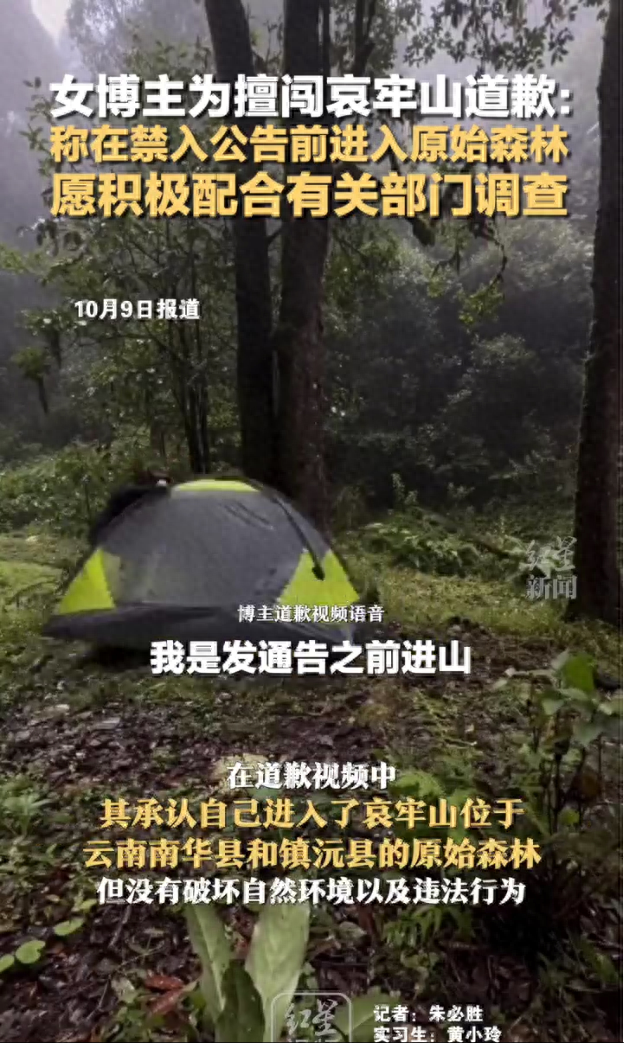 10月9日,博主“苗疆陈朵朵”发视频为国庆假期中进入哀牢山而道歉,“愿意积极配合任何有关部门调查”。在道歉视频中,其承认自己进入了哀牢山位于云南南华县和镇沅县的原始森林但没有破坏自然环境以及违法行为。她还说,是在两地发布严禁个人擅自进入保护区的公告前进的山,公告后未踏入哀牢山半步,“经过这次教训以后,一定先了解政府规定再进山考察。”