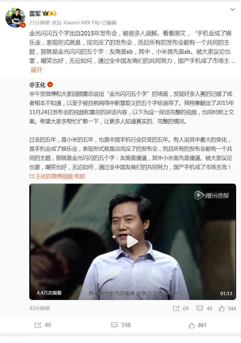 10月9日下午消息,雷军今日在微博上发文,回应网络上流传的“友商是sb”的言论。他称,金光闪闪五个字出自2015年发布会,被很多人误解。看看原文,“手机业成了娱乐业,表现形式就是,没完没了的发布会,而且所有的发布会都有一个共同的主题,那就是金光闪闪的五个字:友商是sb,其中,小米首先是sb。被大家议论也罢,嘲笑也好,无论如何,通过全中国友商们的共同努力,国产手机成了市场主流!”