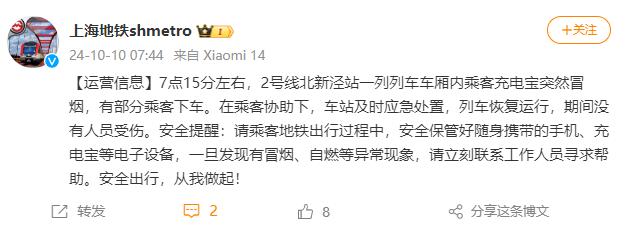 7时44分,@上海地铁shmetro 发布运营信息:7点15分左右,2号线北新泾站一列列车车厢内乘客充电宝突然冒烟,有部分乘客下车。在乘客协助下,车站及时应急处置,列车恢复运行,期间没有人员受伤。安全提醒:请乘客地铁出行过程中,安全保管好随身携带的手机、充电宝等电子设备,一旦发现有冒烟、自燃等异常现象,请立刻联系工作人员寻求帮助。安全出行,从我做起!
