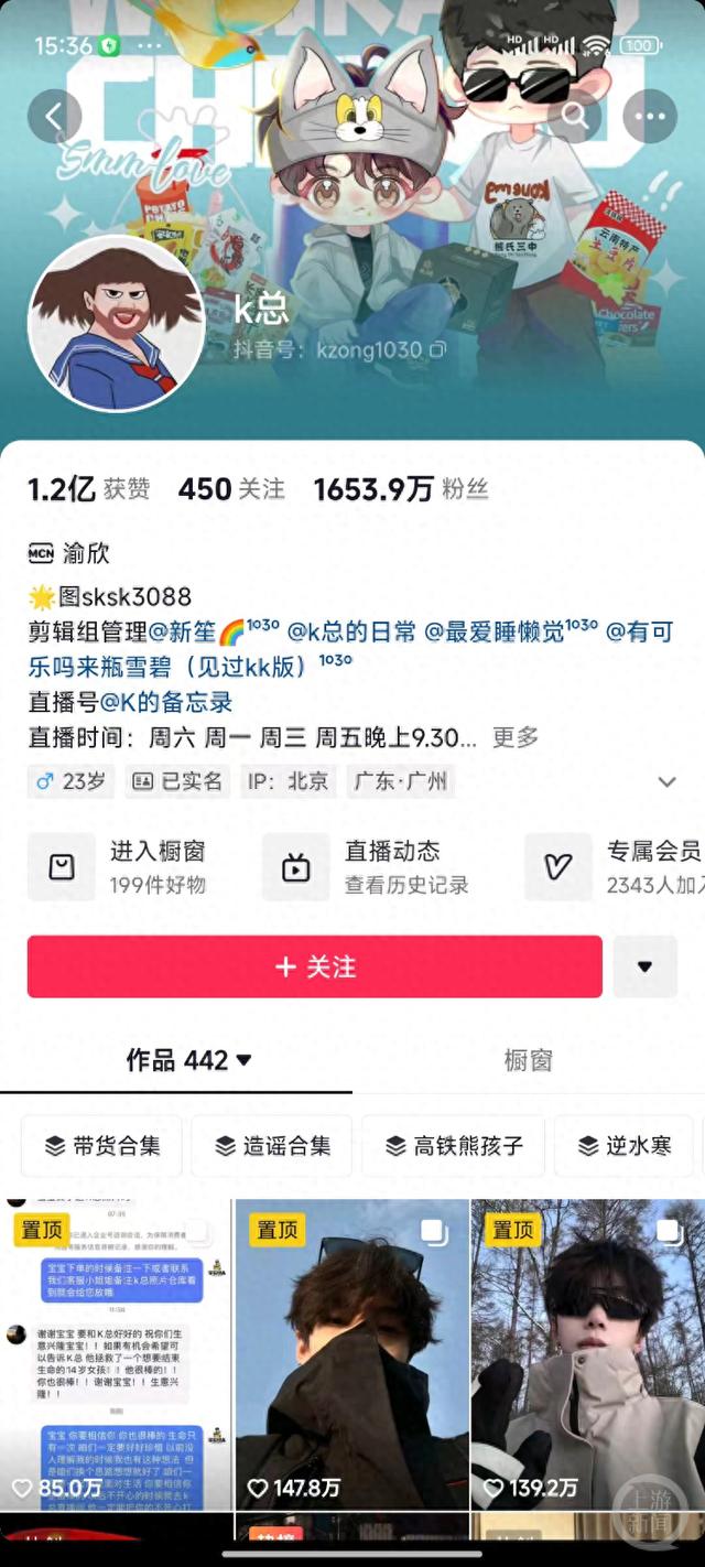 据抖音实名认证信息显示,“k总”本名为陈文康,目前已有440条作品发布,最早的一条发布于2020年1月。据媒体报道,他毕业于广东岭南职业技术学院清远校区,他曾向粉丝分享自己家里从事民宿生意,年少的他也曾在美容院、酒吧等场所打工。从已经发布的短视频作品来看,早期他走颜值博主路线,此后做过游戏主播。最早一条带货直播切片发布于今年5月。