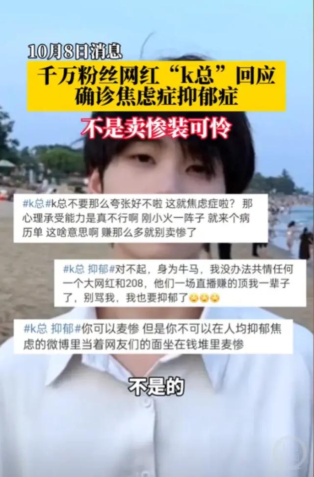 10月10日,上游新闻就此事私信了“k总”,但他并未回复私信。不过他在8日曾通过视频直播表示自己的确“确诊重度抑郁症”。直播中他表示,自己绝对不是“卖惨装可怜”,焦虑症和抑郁症以前就有了,不是今年才有。“以前就有,只是现在复发,加重了。以前是轻度阳光型抑郁症,今年是重度。所以我发了一条某博。就是这样子。”他表示,自己去年就因病停播了三四个月左右,“很多人都知道这个病,一些老粉都知道。”