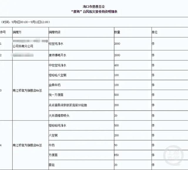 在海口市慈善总会官网网站的“摩羯”台风救灾捐赠公示中,上游新闻记者发现至少有两次捐赠直接与“k总”有关,这些捐赠的物资包括:纯净水400件、八宝粥100件、牛奶100件、方便面500件、抽纸200件、酒精带喷头20件、纯净水500件、八宝粥200件、牛奶50件、方便面850件、面包20件等。