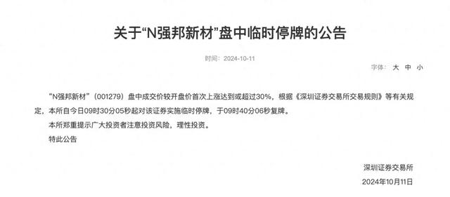 此后,深交所盘中再度发布公告称,“N强邦新材”(001279)盘中成交价较开盘价首次上涨达到或超过60%,根据《深圳证券交易所交易规则》等有关规定,本所自今日9时40分34秒起对该证券实施临时停牌,于9时50分35秒复牌。