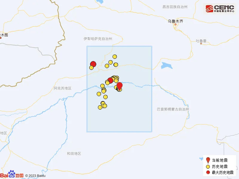 历史地震:根据中国地震台网速报目录,震中周边200公里内近5年来发生3级以上地震共390次,最大地震分别是2024年4月10日在新疆阿克苏地区拜城县发生的5.6级地震(距离本次震中183公里)和2020年1月16日在新疆阿克苏地区库车县发生的5.6级地震(距离本次震中62公里),按震级大小前50次历史地震分布如图。