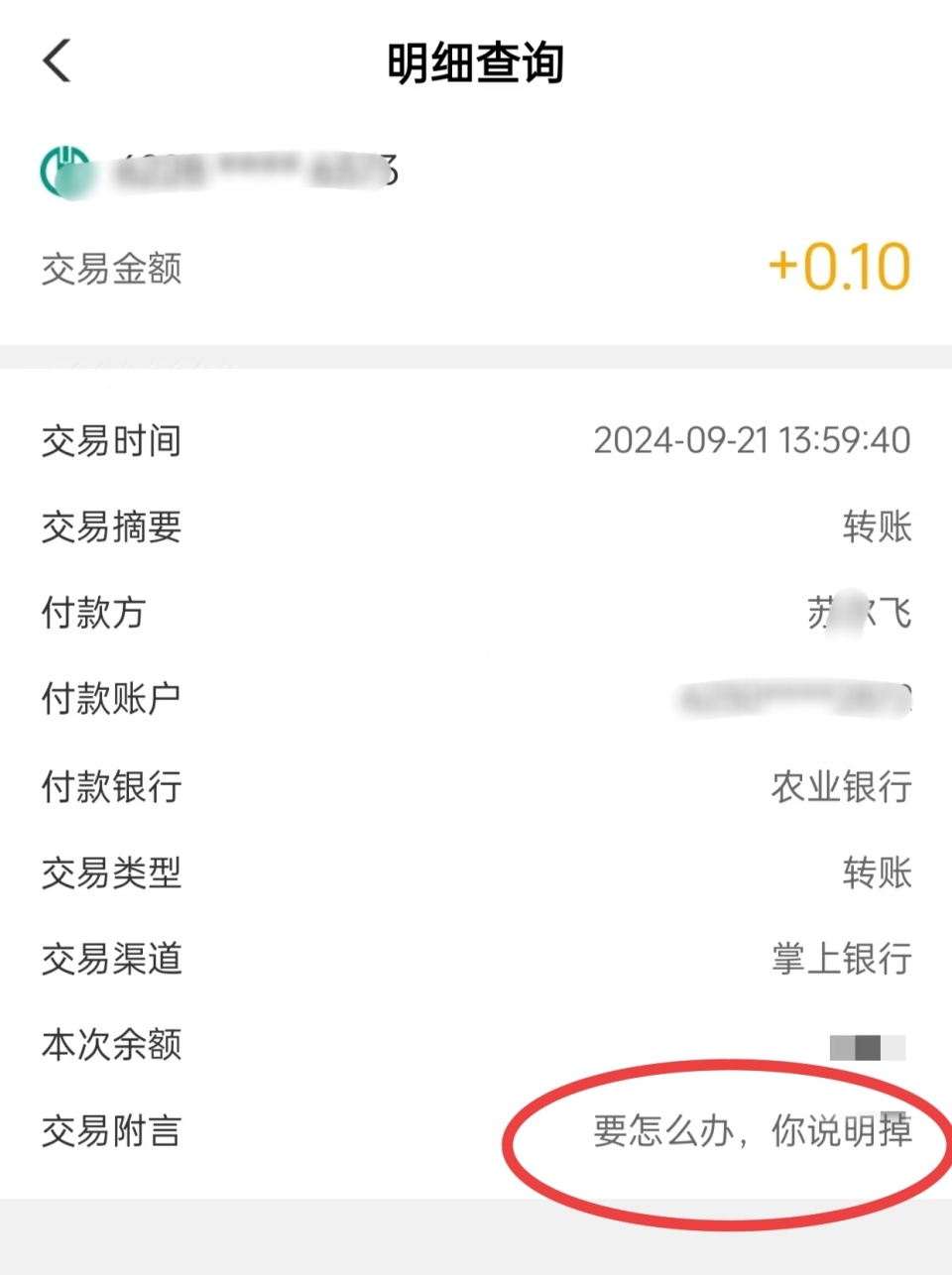 刘薇称,自9月与苏某飞取得联系后,两人一直通过手机转账留言的方式保持联系,但问题仍未解决。在她看来,此事并未终结,没有给自己以及所有关心此事的人一个交代,她希望对方能出面,拿出态度,解决问题,给自己一个交代。