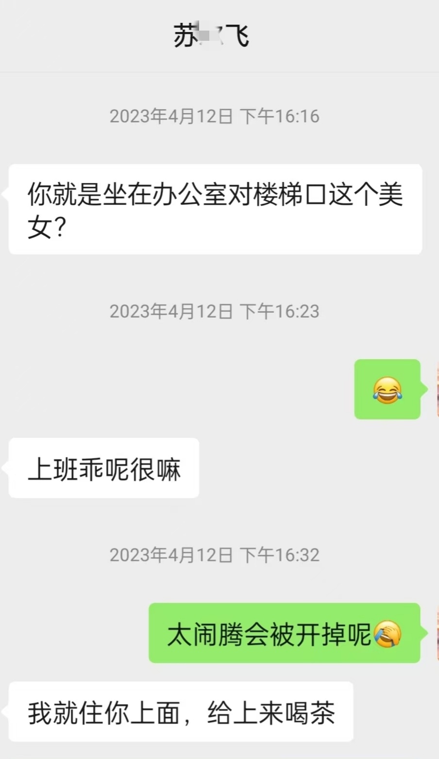 刘薇提供的聊天记录显示,2023年4月12日,一个备注为“苏某飞”的账号连续发来“你就是坐在办公室对楼梯口这个美女?”“上班乖呢很嘛”“我就住你上面,给(可)上来喝茶”等多条消息。2024年6月的产科检查报告显示,当事人宫内早孕8周。