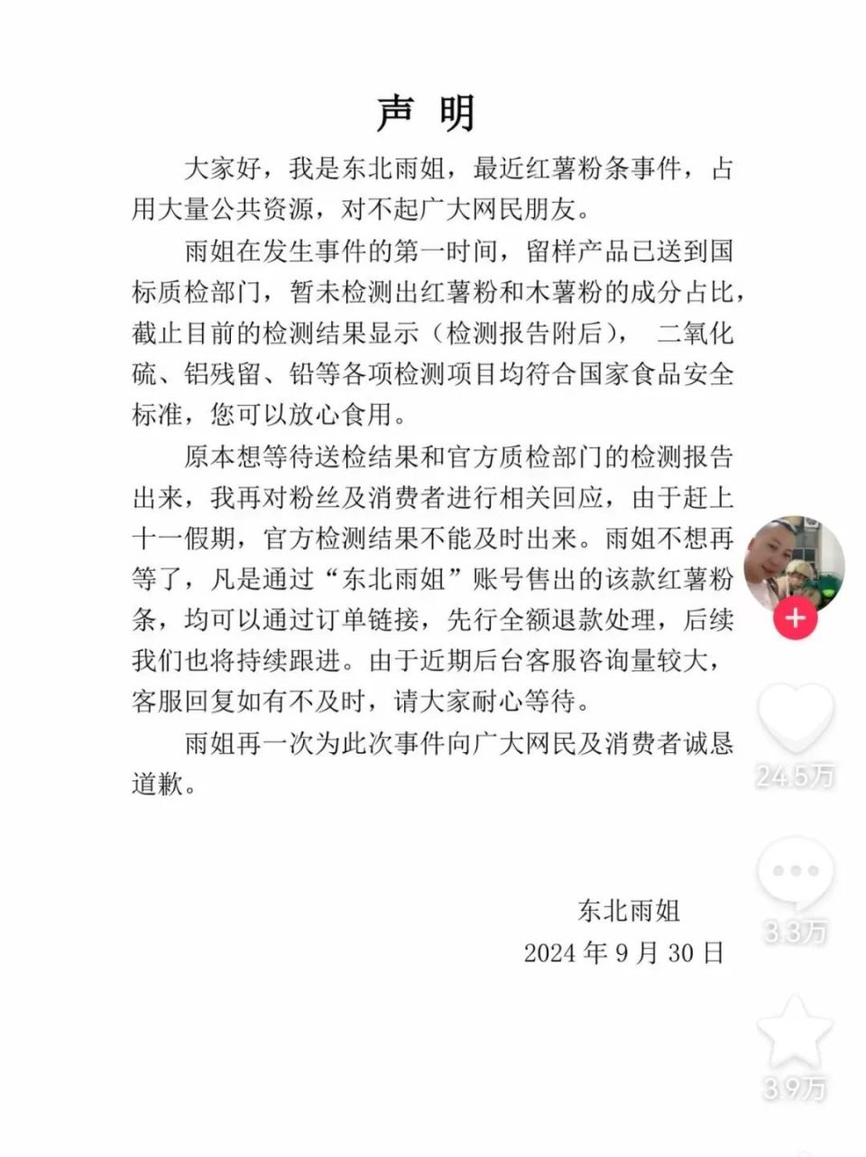 值得一提的是,9月30日,“东北雨姐”曾更新视频发布《声明》称,送去质检的红薯粉“暂未检出红薯粉和木薯粉的成分占比”。但是,送检的红薯粉“二氧化硫、铝残留、铅等各项检测项目均符合国家食品安全标准”。“东北雨姐”声称,“凡是通过‘东北雨姐’账号售出的该款红薯粉条,均可以通过订单链接,先行全额退款处理”。