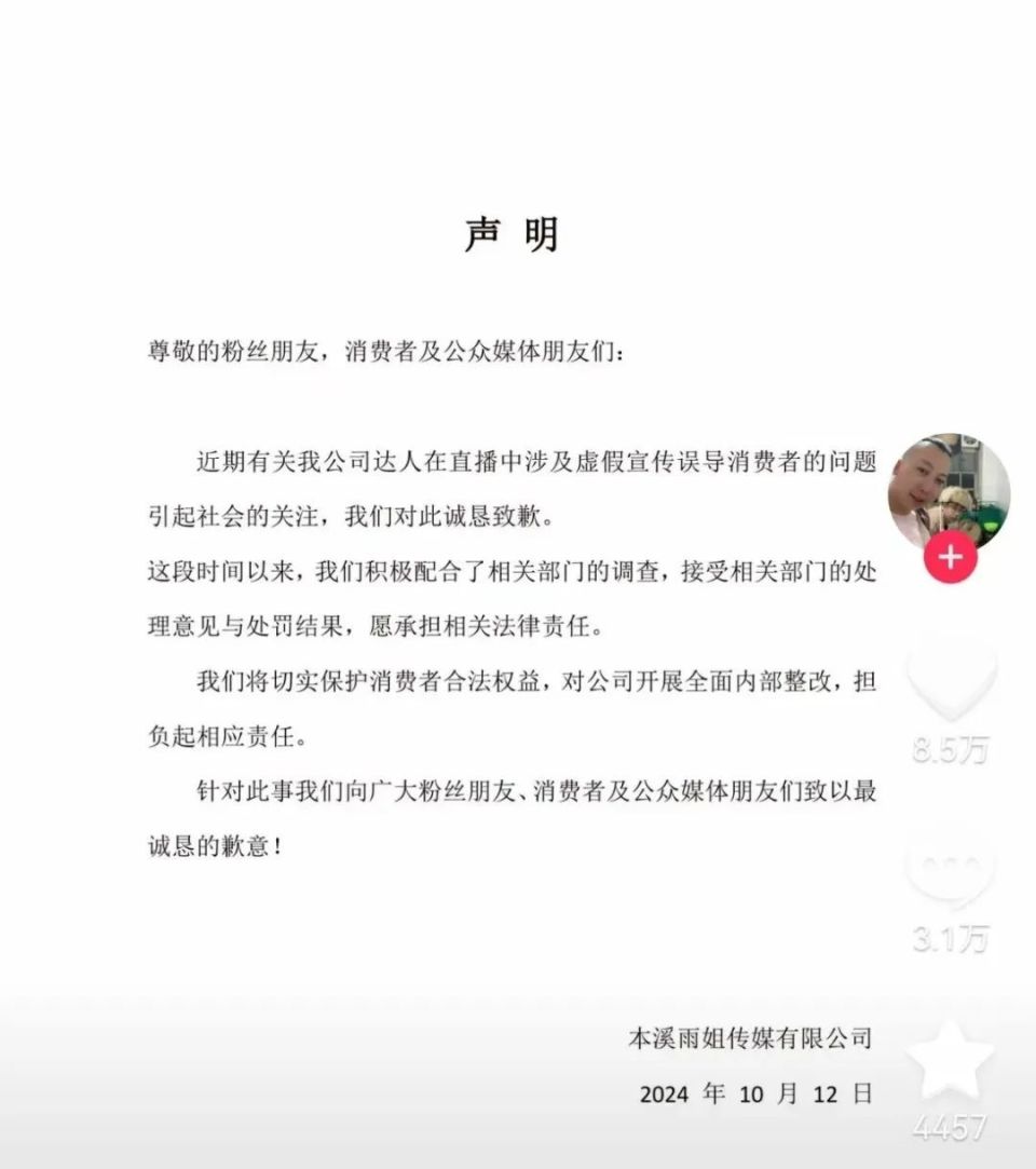 声明中称,近期有关我公司达人在直播中涉及虚假宣传误导消费者的问题引起社会的关注,对此诚恳致歉。“这段时间以来,我们积极配合了相关部门的调查,接受相关部门的处理意见与处罚结果,愿承担相关法律责任。我们将切实保护消费者合法权益,对公司开展全面内部整改,担负起相应责任。”