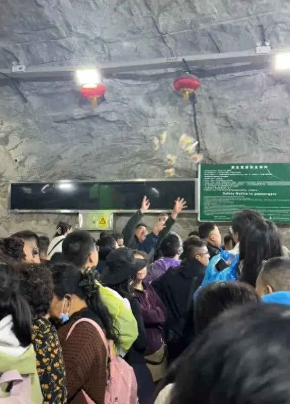 游客提供的现场视频显示,有身穿制服的工作人员在维持秩序。现场有工作人员向游客分发点心,现场游客排队有序。