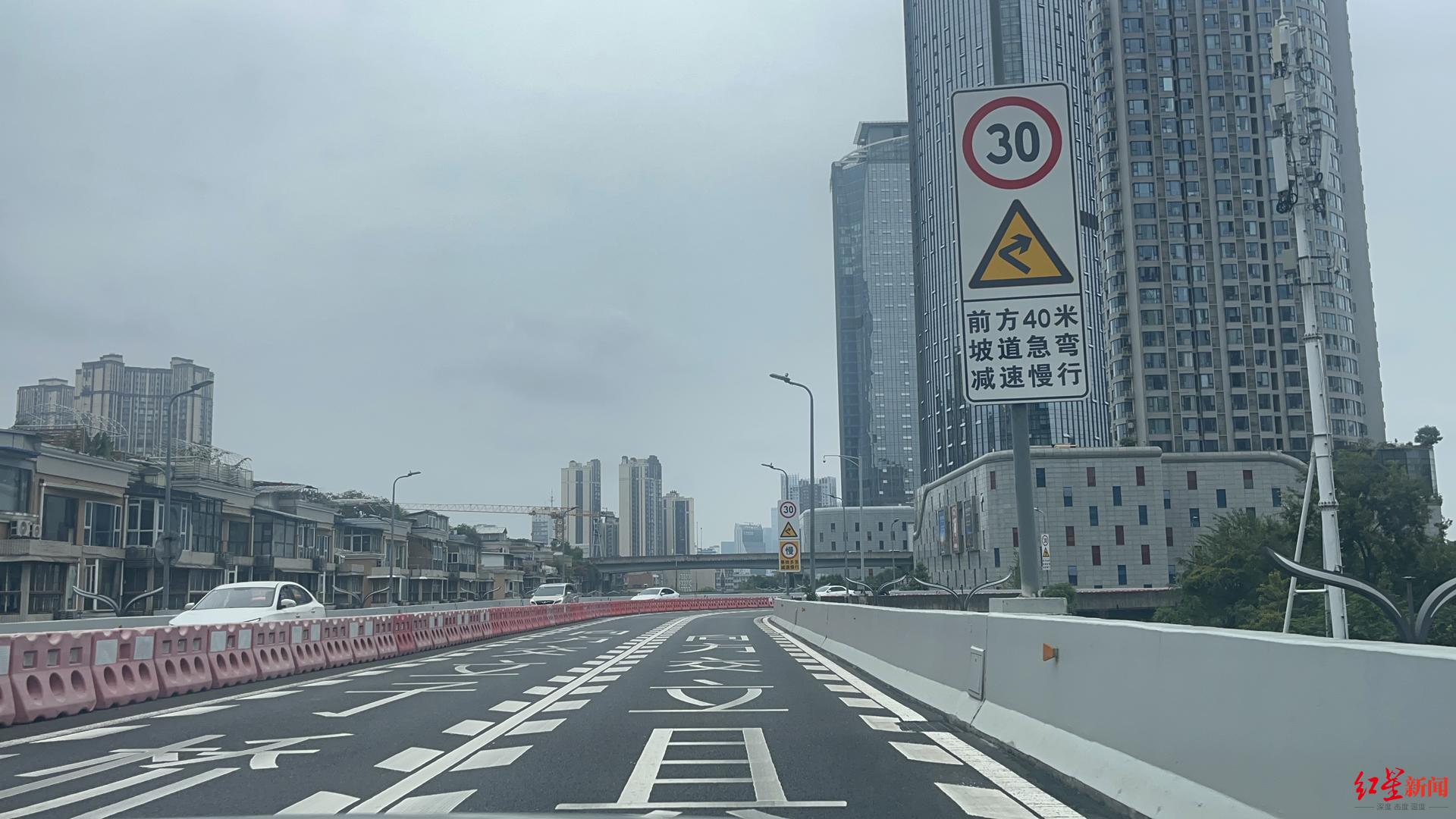 记者在现场看到,因为地处匝道,其间路程限速30码。从二环驶入匝道到完全下桥,车程约1分30秒。其中,在二环高架路杉板桥段上行匝道,沿途有多块坡道急弯提示牌(90米、40米、20米),提醒驾驶员减速慢行。还有多块限速标志,以及事故多发、减速慢行的指示牌标志。