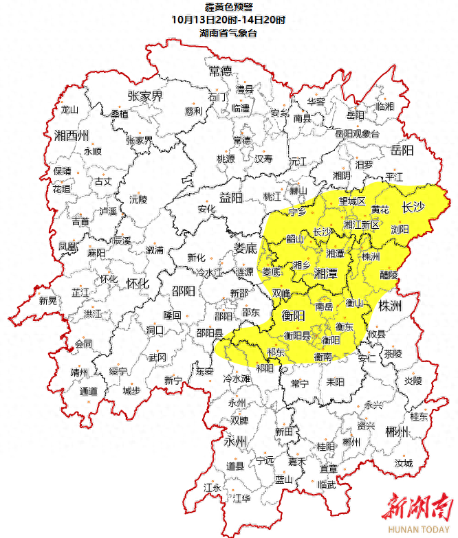 最近几天,在短暂晴暖天气后,霾突袭湖南中部、北部多地。今天,省气象发布霾黄色预警,预计10月13日20时至14日20时,长沙、株洲北部、湘潭、衡阳、娄底东南部将出现中度霾。