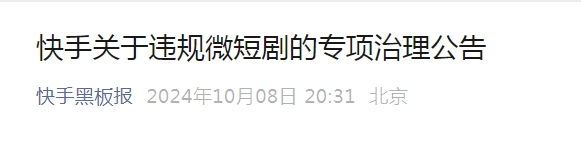 抖音表示,对违规微短剧内容零容忍,呼吁广大网友一起监督,积极投诉举报违规微短剧及违规推广微短剧的行为、内容及账号。10月8日,“快手黑板报”微信公众号发布《快手关于违规微短剧的专项治理公告》。公告称,近期,平台在日常巡查中发现,部分微短剧存在内容低俗,价值导向偏差等问题,扰乱了社区健康生态。目前,平台已根据社区规则,下架违规微短剧剧集,并排查清理相关视频。违规剧集相关发布账号已被平台永久封禁,“湖南****公司”等3家相关机构已被清退,并永不合作。