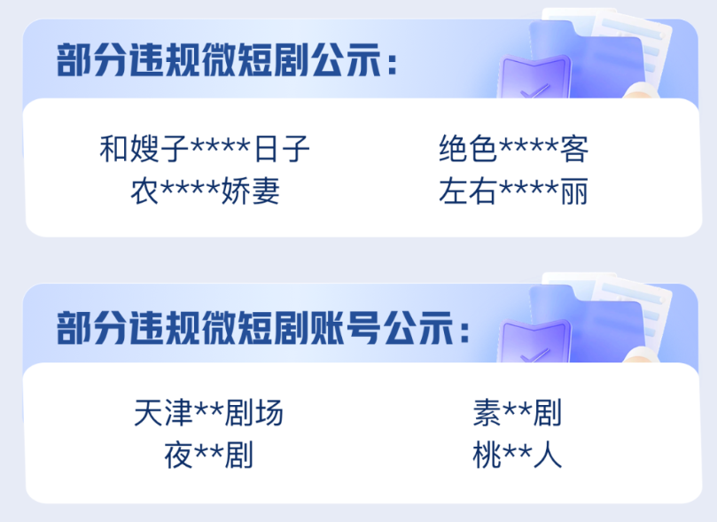 部分违规微短剧账号公示如下:甜****天、麒**剧、红**场、杏**剧、青**场、邻****事、风**看????(好*版)、奇**刻、赐**剧、每**场。