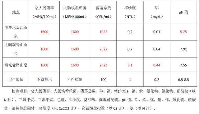 据了解,深圳不止梧桐山出现过这种情况。今年4月份曾有媒体报道过,坂田街道食药安办的工作人员对鸡公山的3处取水点进行采样检测,结果显示菌落总数超标,同时,也检测出总大肠菌群以及大肠埃希氏菌。早在2023年10月的时候深圳大鹏新区疾控中心公卫科就随机选取了辖区3个山泉水采水口,共采集3个样品。按照GB5749-2006《生活饮用水卫生标准》检测生活饮用水常规项目检测28项及氨进行实验检测,结果显示所有山泉水样品中微生物指标均超标。