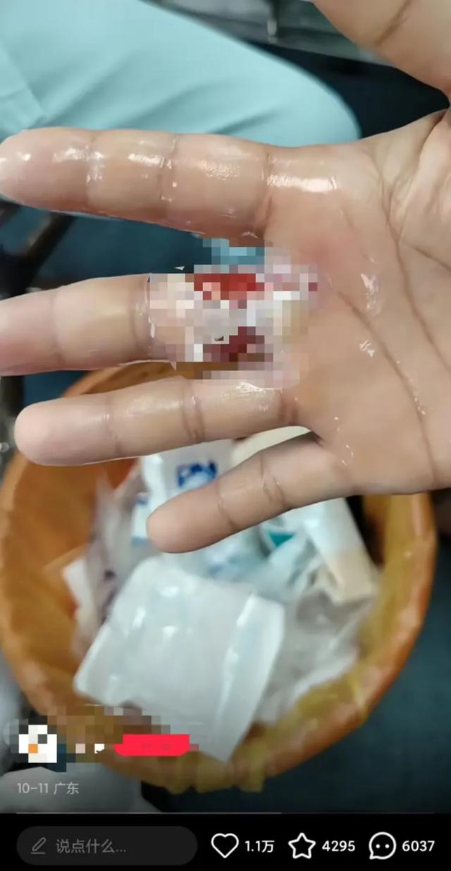 该女子在10月12日又更新了社交平台信息,配上治疗手指的图片,看上去伤情更为严重,并称自己已经到深圳市第二人民医院挂急诊烧伤科,“医生说是化学品烧伤,给开了葡萄糖酸钙,把手指头烧伤的皮肤全部剔除,手指头都烂了。然后从手指头骨头边打药水进去,喷生长因子,抹药膏包扎。第二天换药手肿了发炎,打了消炎针。第三天手起泡了,可能包扎太厚不透气,明天继续换药。”
