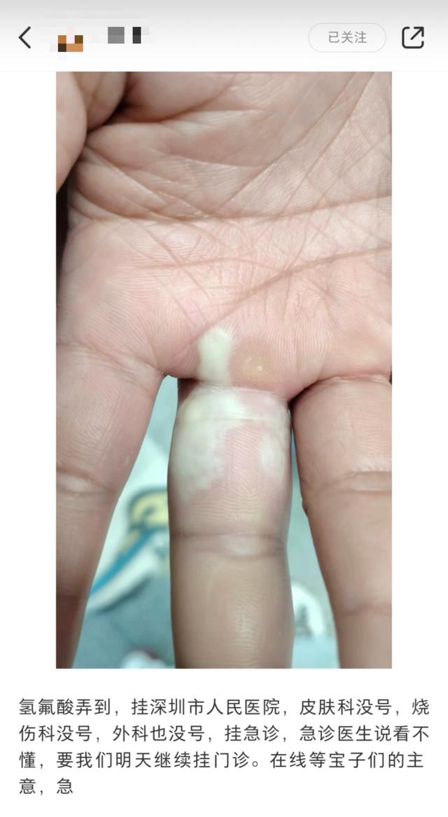 10月9日,“氢氟酸沾了小半个手指就有严重后果”词条在社交平台上引起热议。起因是一名深圳女子在社交平台发帖求助称,自己的手指沾染氢氟酸,在深圳某医院无法治疗,还配上了沾染化学品的图片。